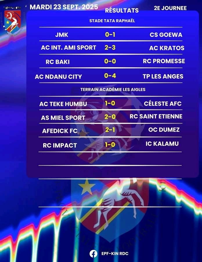 TP Les Anges s’est largement imposé devant AC Ndanu City par le score de 4 buts à 0, mardi 23 septembre 2025, en marge de la 2ème journée de l’Entente Provinciale de Football de Kinshasa, EPF-KIN 2025-2026 au Stade Tata Raphaël.