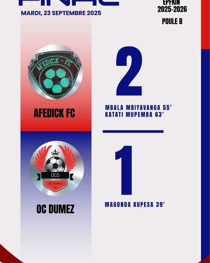 Dumez avait le score par l’entremise de Mangonda Kupesa (39′) puis Affedick a égalisé puis pris les commandes grâce à Mbala Mbiyavanga (55′) et Katati Mupemba (63′), une saison qui commence bien pour les ex-champions de l’EPF-KIN/LUKUNGA.