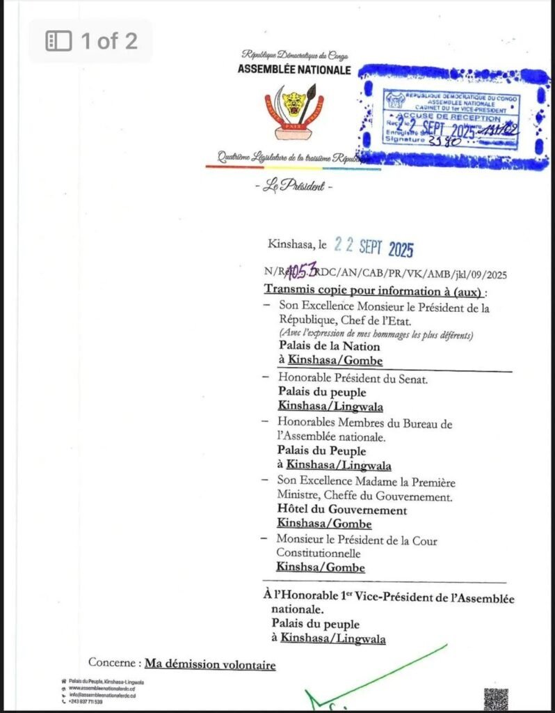 Visé par une pétition pour sa destitution ainsi que son bureau , le président de l’assemblée nationale, Vital Kamerhe a démission de son poste ce lundi 22 septembre 2025 à quelques heure de la plénière consacré à l’examen du rapport de la commission chargé traiter les pétitions déposées contre plusieurs membres du Bureau de la Chambre basse.