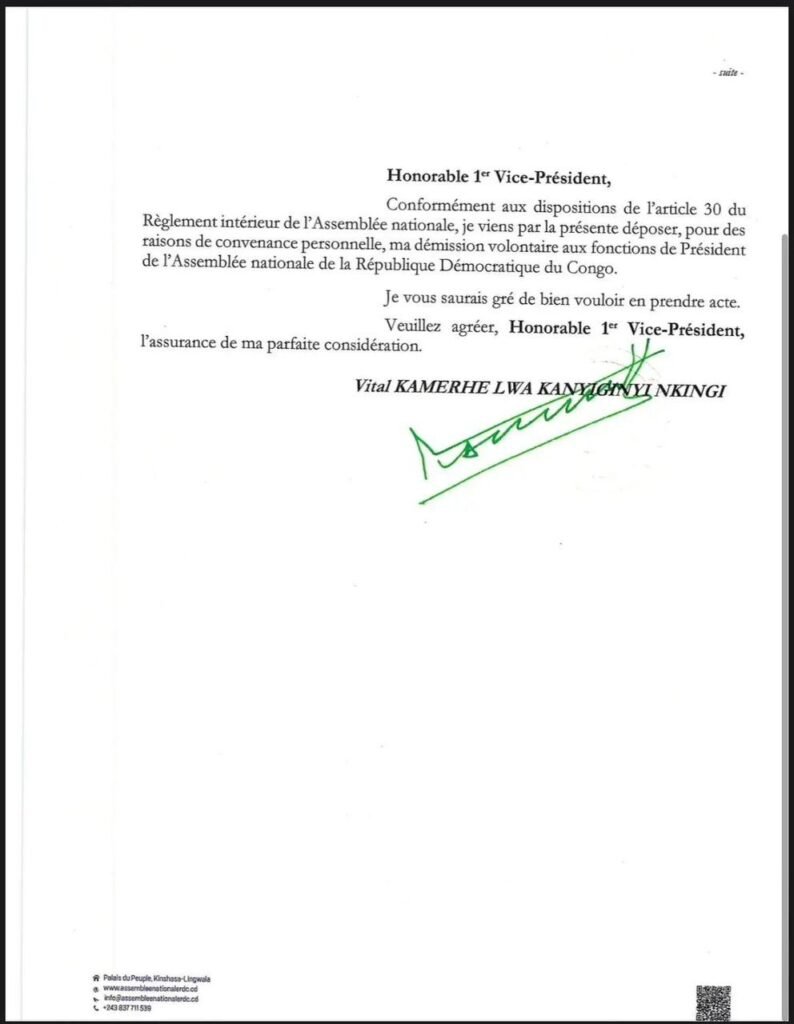 Alors qu’il faisait l’objet d’une pétition initiée par un groupe de députés nationaux réclamant son départ, le président de l’UNC Vital Kamerhe a officiellement déposé sa lettre de démission à la conférence des présidents, organe de concertation regroupant les responsables des groupes parlementaires et des commissions permanentes.