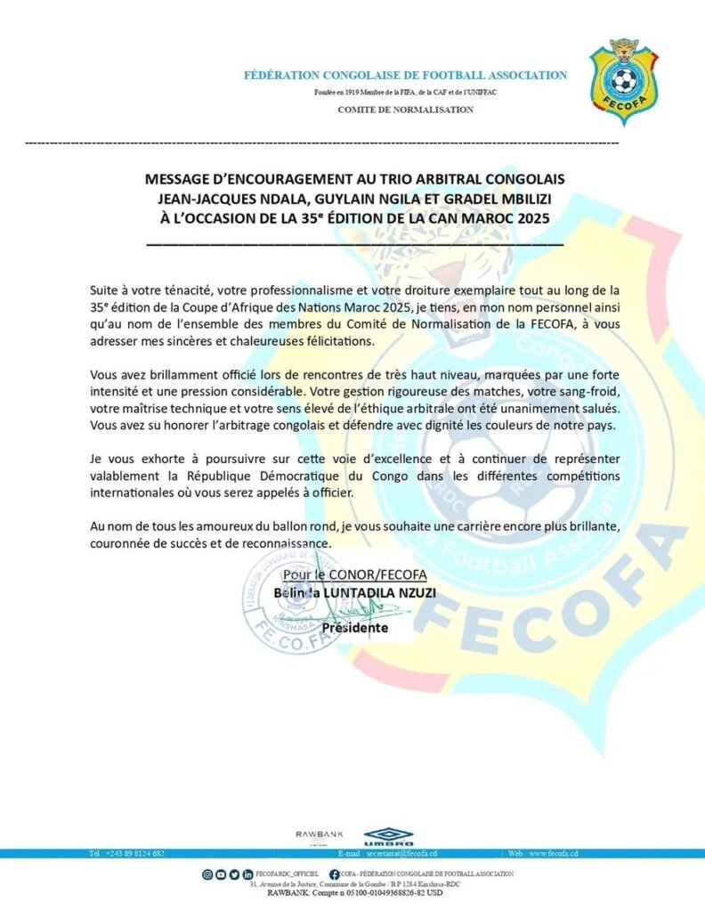 Dans un communiqué publié , le comité de de normalisation de la fédération Congolaise de football Association a félicité le trio arbitral congolais ayant dirigé la finale de la 35ème édition de la Coupe d’Afrique des Nations ponctuée par le sacre du Sénégal face au Maroc aux prolongations (1-0).