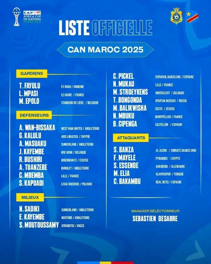 Dans la liste des 26 Léopards sélectionnés par le sélectionneur national de la République Démocratique du Congo, Sébastien Desabre pour la 35ème édition de la Coupe d’Afrique des Nations Maroc 2025, qui ira du 21 décembre au 18 janvier 2026. L’on constate l’absence de 11 joueurs présents à la dernière édition et, 13 joueurs qui vont découvrir la plus grande compétition africaine.