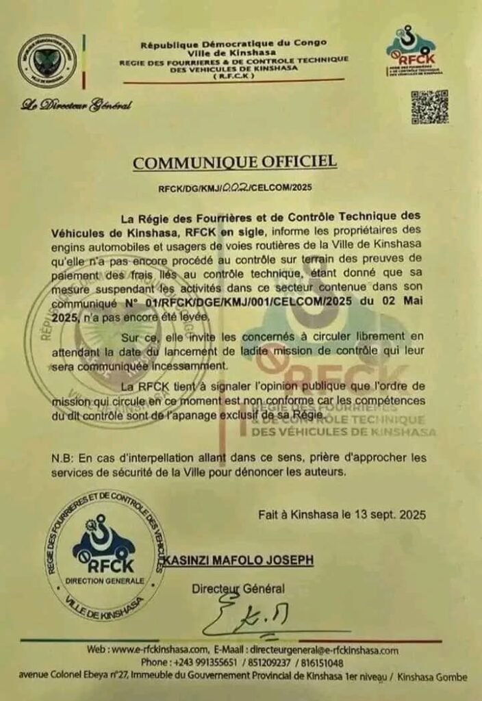 Dans un communiqué paru le 13 septembre 2025, la Régie des Fourrières et de contrôle Techbique des Véhicules de Kinshasa (RFCK) informe à tous les propriétaires des engins automobiles et usagés des voies routières de la ville de Kinshasa que le contrôle pour le paiement des frais liés au contrôle technique n’a pas encore débuté.