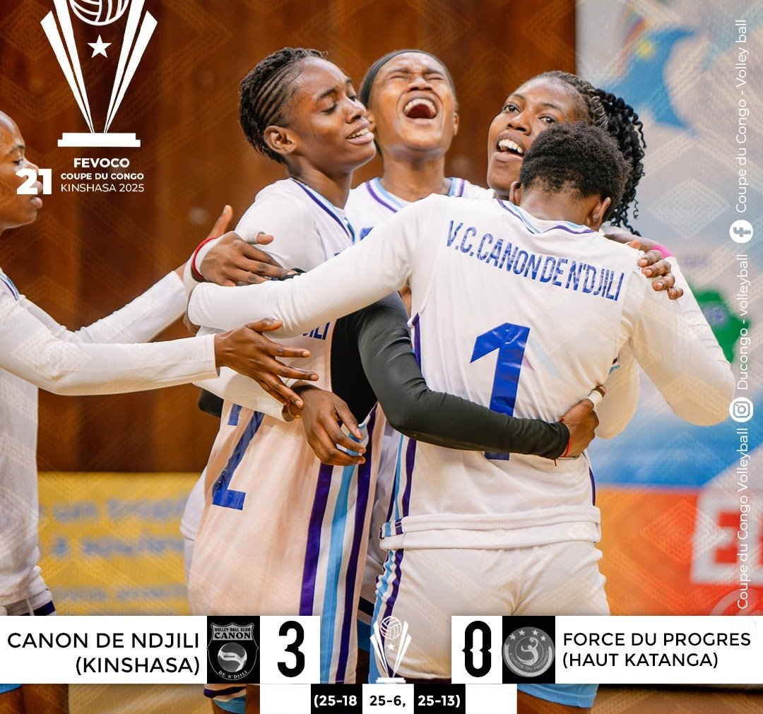 8 fois champion du Congo, VC Canon de N’djili (Kinshasa) s’est offert une victoire après avoir battu au tie-break contre les Aigles du Congo (Kinshasa), samedi 23 août 2025, contre VC Force du Progrès (Haut-Katanga) par le score de 3 sets à 0 (12-25, 16-25, 16-25) au gymnase de la Police Nationale Congolaise, PNC.