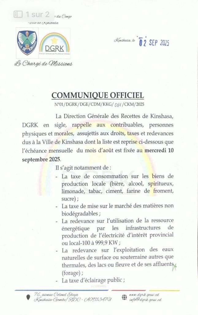 Dans son communiqué N°01/DGRK/DGE/CDM/KKG/ 091 / CKM/2025 publié ce mardi 02 septembre 2025, Direction Générale des Recettes de Kinshasa, DGRK en sigle, rappelle aux contribuables, personnes physiques et morales, assujettis aux droits, taxes et redevances dus à la Ville de Kinshasa que l’échéance mensuelle du mois d’août est fixée au mercredi 10 septembre 2025.