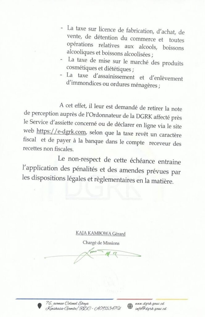 Il est demandé à toutes personnes retirer la note de perception auprès de l’Ordonnateur de la DGRK soit d’aller sur le site web https://e-dgrk.com et de payer à la banque dans le compte receveur des recettes non fiscales.