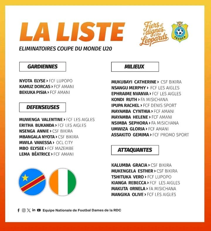 La sélectionneuse des Léopards féminins U20, Sandra Makombele a annoncé la liste de 26 sélectionnées pour la double-confrontation face aux Éléphantes de la Côte d’Ivoire en marge de la 3ème et avant dernier tout des éliminatoires de la Coupe du Monde Pologne 2026.