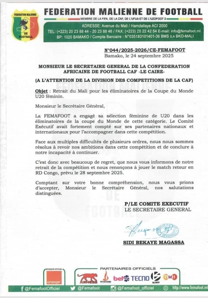 L’annonce a été faite à travers un communiqué officiel signé par le secrétaire général de la Fédération malienne de football (FEMAFOOT), Sidi Bekaye Magassa, et adressé à la Confédération Africaine de Football (CAF).