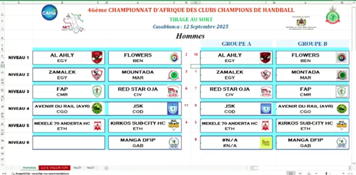 Le groupe B aura Montada Derb Soltane du Maroc aura fort à faire face à Flowers du Bénin, FAP du Cameroun, Avenir du Rail du Congo, Kirkos Sub-City HC d’Éthiopie et Manga DFIP du Gabon.