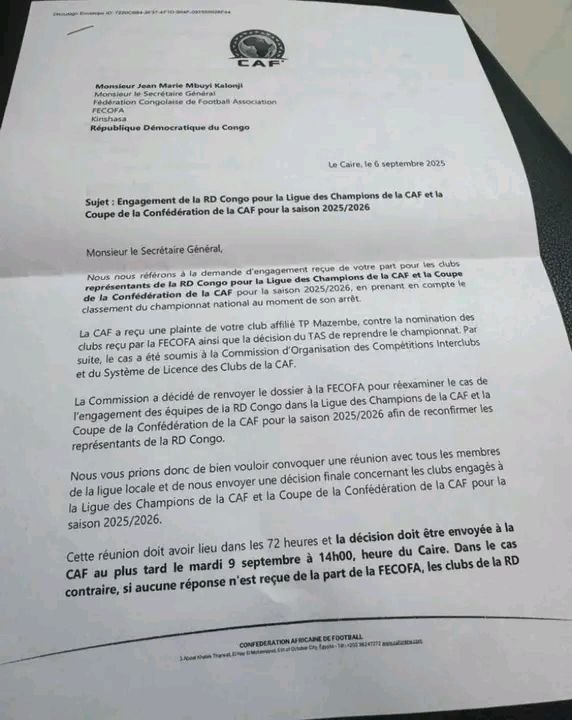 “ Cette réunion doit avoir lieu dans les 72 heures et la décision doit être envoyée à la CAF au plus tard le mardi 9 septembre à 14h00, heure du Caire. Dans le cas contraire, si aucune réponse n’est reçue de la part de la FECOFA, les clubs de la RD Congo seront exclus des Compétitions Interclubs de la CAF pour la saison 2025/2026. ” l’extrait de la correspondance.
