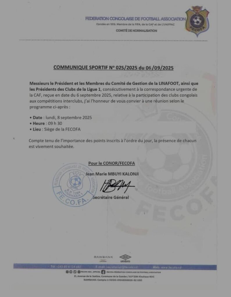 Messieurs le Président et les Membres du Comité de Gestion de la LINAFOOT, ainsi que les Présidents des Clubs de la Ligue 1, consécutivement à la correspondance urgente de la CAF, reçue en date du 6 septembre 2025, relative à la participation des clubs congolais aux compétitions interclubs, j’ai l’honneur de vous convier à une réunion selon le programme ci-après :