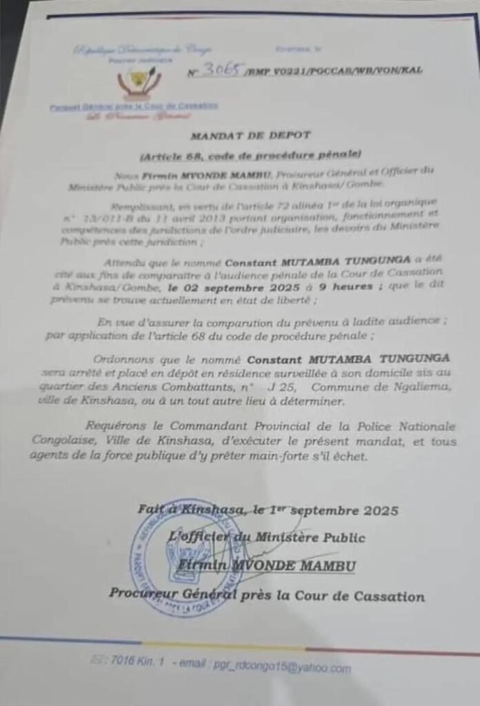 À quelques heures du verdict du procès Mutamba , le président de la cour de cassation Kinshasa\Gombe , Firmin Mvonde a ordonné l’arrestation du prévenu et sa mise en résidence surveillé à son domicile situé au quartier des Anciens Combattants, n*J 25, Commune de Ngaliema, ville de Kinshasa, ou à un tout autre lieu à déterminer.