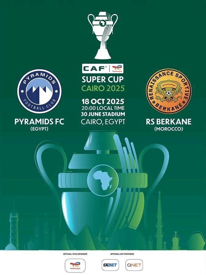 La Confédération Africaine de Football (CAF) a annoncé via ses canaux officiels la tenue de la Super Coupe CAF 2025 pour samedi 18 octobre 2025 au Stade du 30 Juin du Caire, en Égypte, à 20 heures locales. Elle opposera Pyramids FC d’Égypte (champion de la Ligue des Champions 2025) à la Renaissance Sportive Berkane du Maroc (championne de la Coupe de la CAF 2025).