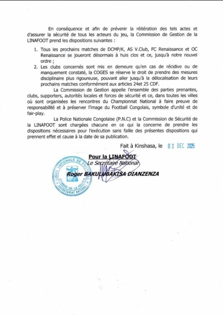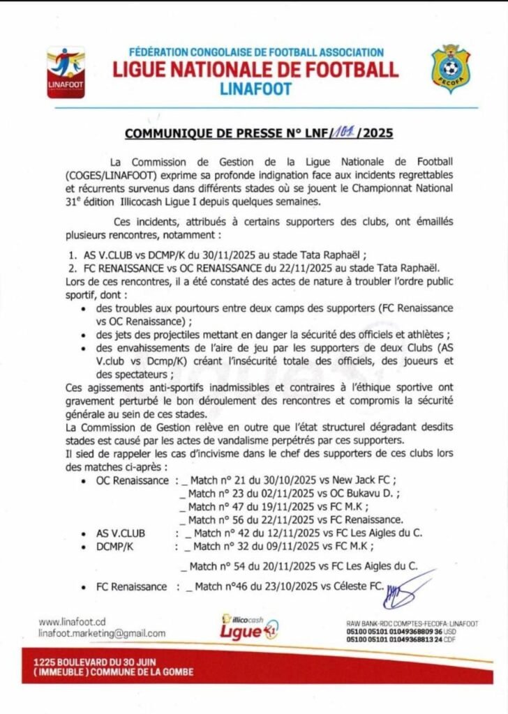 La Commission de Gestion de la Ligue Nationale de Football (COGES/LINAFOOT) frappe OC Renaissance du Congo, AS Vita Club, DC Motema Pembe et FC OC Renaissance du Congo par la tenue des matchs à huit-clos, mercredi 3 décembre 2025, via le communiqué de Presse N° LNF/10A/2025.